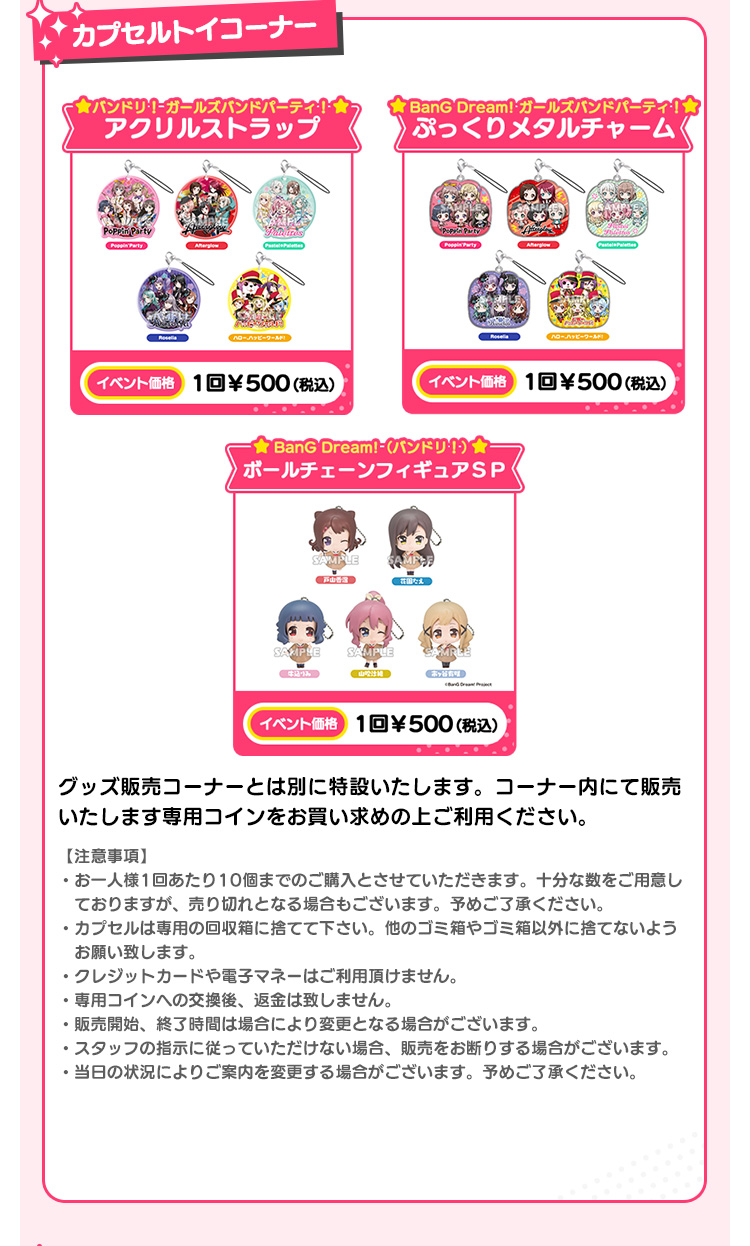 ガルパーティ!キラキラガチャ♪ ガルパーティ! キラキラガチャ♪ イベント価格 1回¥500(税込) ガールズバンドパーティ!のガチャが体験できる「ガルパーティ!キラキラガチャ♪」。登場したメンバーのバンドをイメージしたシリコンバンドを手に入れよう! ※シリコンバンドは無くなり次第終了となります。登場したメンバーの対象シリコンバンドがなくなっていた場合は、再度「ガルパーティ!キラキラガチャ♪」を体験し直して頂き、登場したメンバーの対象シリコンバンドをプレゼント致します。