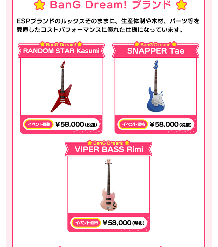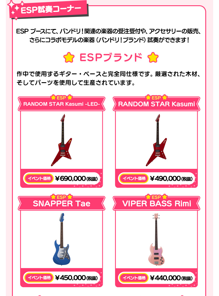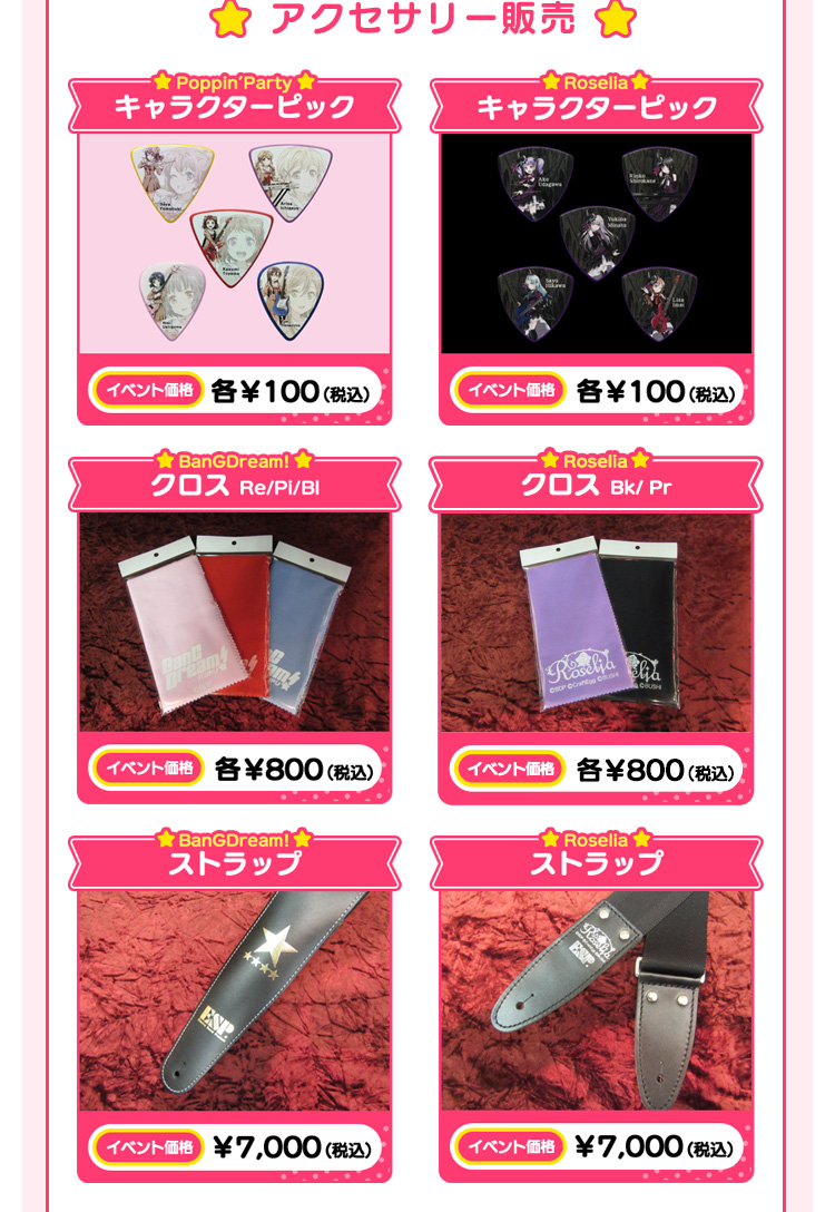 アニメ1期原画展示 アニメ1期のOP、ED、13話から一部の原画を展示!お気に入りシーンの原画を見られるチャンスかも!?/カードパネル展示 「ガルパ」に登場するカードイラストをB2サイズのパネルで展示!ビッグサイズの美麗イラストを鑑賞しよう!/等身大キャラポップ展示 「ガルパ」登場キャラクター総勢25人の等身大ポップが並びます!圧巻の光景間違いなし★/SDキャラクタースタンディポップ展示 SDキャラクターのスタンディポップが登場!キュートなサイズになった「ガルパ」キャラクターに会いに来てください♪/ミッシェル着ぐるみ撮影会 会場にミッシェル着ぐるみが登場!歩く姿を眺めたり、一緒に写真を撮ったりしよう!/ライブ衣装・楽器展示 Poppin’Party、Roseliaのバンド衣装&楽器を展示!今までのライブの感動を振り返ろう★/TVアニメ振り返り上映会 TVアニメ「BanG Dream!」を上映!香澄たちのアニメでの活躍をみんなで応援しよう!/コラボ商品展示エリア バンドリ!プロジェクトが今までコラボしてきた商品を展示!