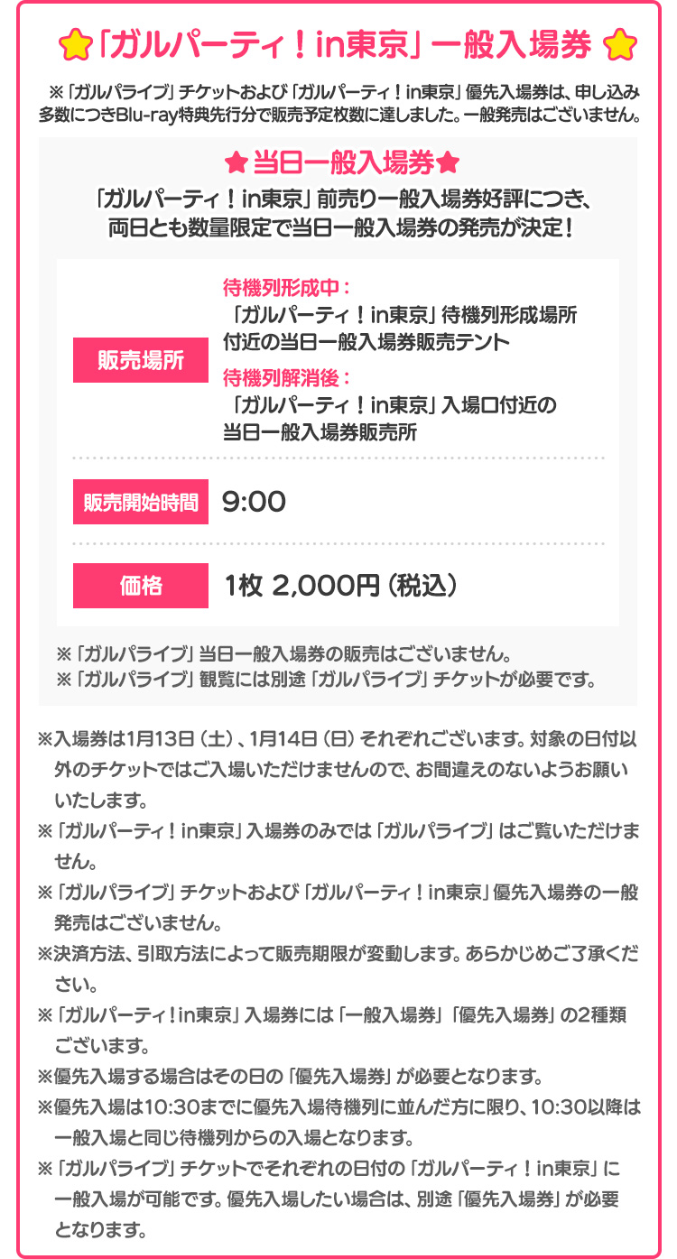 ガルパライブチケット 7,500円(税込) ※1月13日(土)公演・指定席※「ガルパーティ!in東京」1月13日(土)一般入場が可能です。 ガルパーティ!in東京 優先入場券1,500円(税込) ※1月13日(土)のみ入場可能※こちらのみでは「ガルパライブ」の観覧はできません。