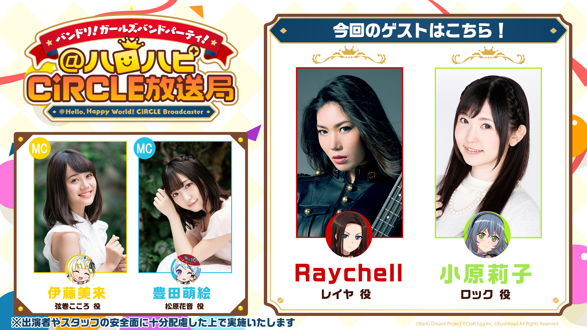 生放送番組「バンドリ! ガールズバンドパーティ!@ハロハピCiRCLE放送局」では、番組MCとして「ハロー、ハッピーワールド!」の弦巻こころ役の伊藤美来さんと、松原花音役の豊田萌絵さんが、「バンドリ! ガールズバンドパーティ!」の出演キャストをゲストに迎え、「バンドリ! ガールズバンドパーティ!」に関する最新情報をお届けします!