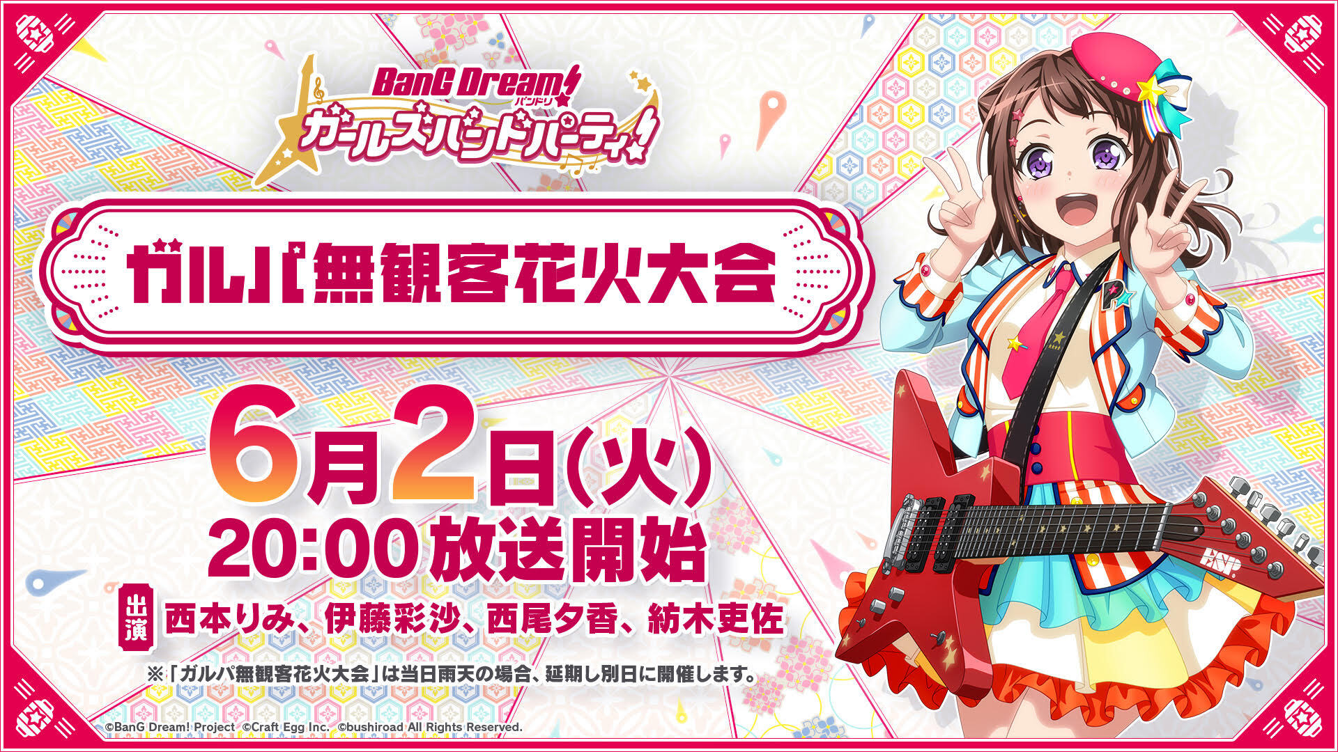 「ガルパ無観客花火大会」では、初夏を感じられる花火大会の模様を、「バンドリ! ガールズバンドパーティ!」の出演キャストとともに生放送にてお届けいたします。