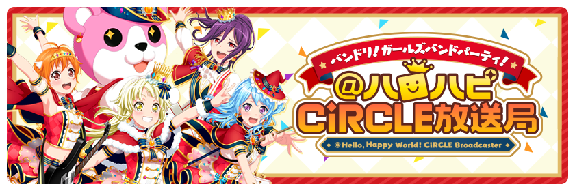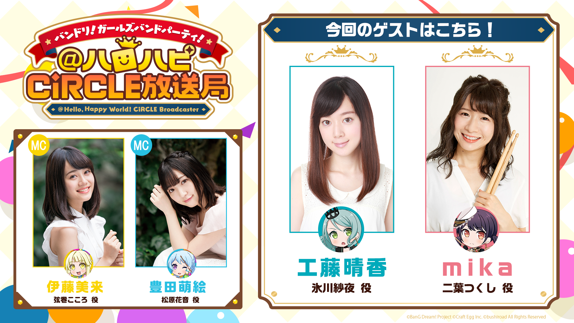 生放送番組「バンドリ! ガールズバンドパーティ!@ハロハピCiRCLE放送局」では、番組MCとして「ハロー、ハッピーワールド!」の弦巻こころ役の伊藤美来さんと、松原花音役の豊田萌絵さんが、「バンドリ! ガールズバンドパーティ!」の出演キャストをゲストに迎え、「バンドリ! ガールズバンドパーティ!」に関する最新情報をお届けします!