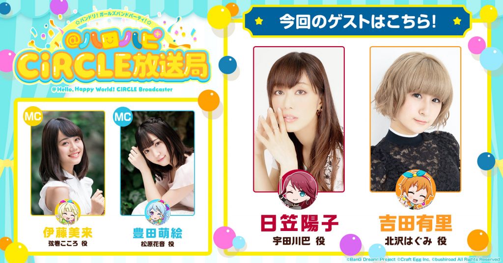 生放送番組「バンドリ! ガールズバンドパーティ!@ハロハピCiRCLE放送局」では、番組MCとして「ハロー、ハッピーワールド!」の弦巻こころ役の伊藤美来さんと、松原花音役の豊田萌絵さんが、「バンドリ! ガールズバンドパーティ!」の出演キャストをゲストに迎え、「バンドリ! ガールズバンドパーティ!」に関する最新情報をお届けします!