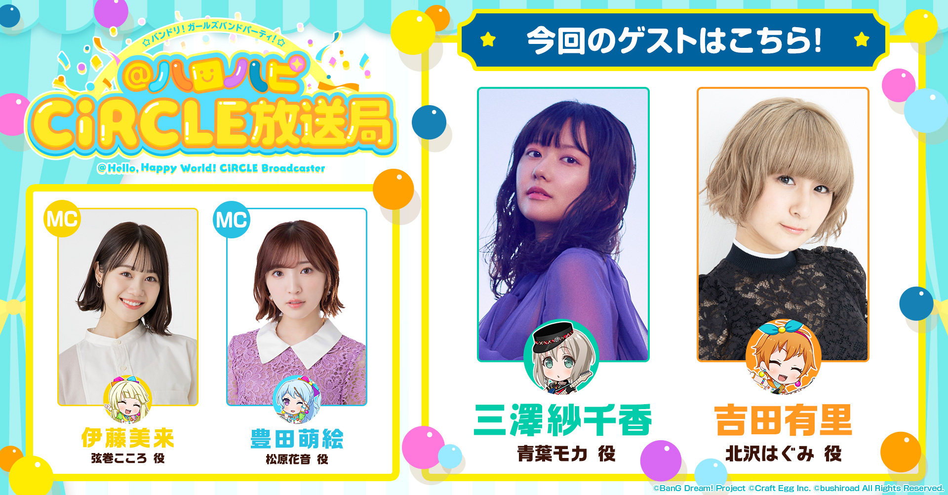 生放送番組「バンドリ! ガールズバンドパーティ!@ハロハピCiRCLE放送局」では、番組MCとして「ハロー、ハッピーワールド!」の弦巻こころ役の伊藤美来さんと、松原花音役の豊田萌絵さんが、「バンドリ! ガールズバンドパーティ!」の出演キャストをゲストに迎え、「バンドリ! ガールズバンドパーティ!」に関する最新情報をお届けします!
