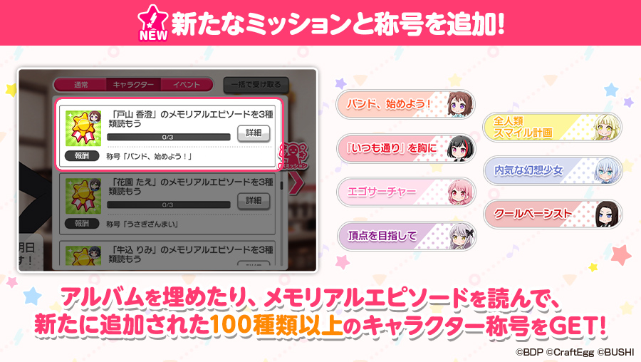 ・キャラクターごとのメモリアルエピソードを読むことで、各キャラクターの称号が獲得できるミッションが追加されます。
