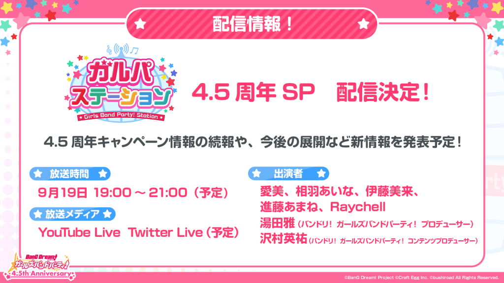 キャンペーンの詳細やハッシュタグは「ガルパステーション 4.5周年SP」番組冒頭で発表予定です。