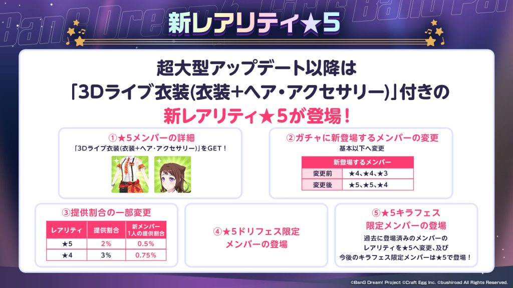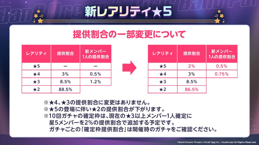 そこで、新しいレアリティである★5の新メンバーを、今の★4と同じ出現割合(新メンバー1人の提供割合0.5%)で追加する形が一番良いだろう、という判断をしました。
