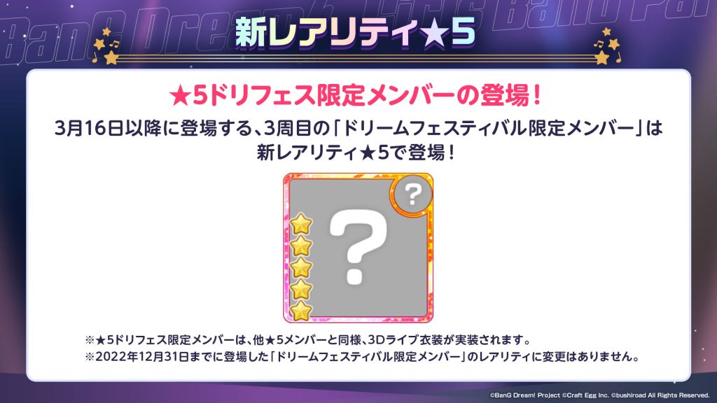 そして「ドリフェス限定メンバー」についてですが、2周目が2020年3月16日の登場から一巡し、2022年12月31日に登場した友希那、パレオ、千聖の3名で35名全員が揃いました。3周目となる2023年3月16日以降に登場する新たなドリフェス限定メンバーは★5で登場します。