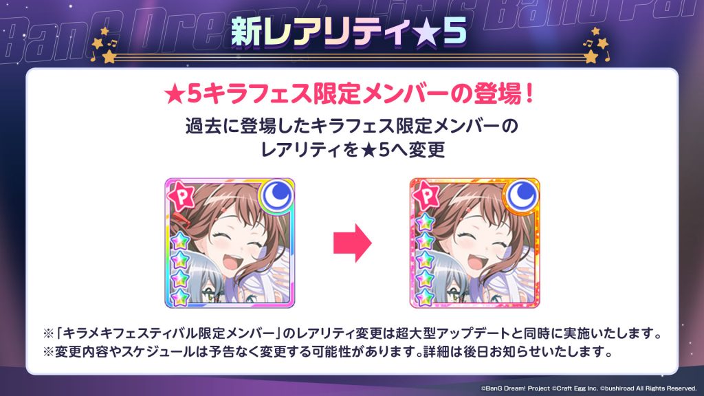こちらのレアリティの変更につきまして、すでに★4メンバーとして獲得済みの「キラフェス限定メンバー」は、超大型アップデート前に実施するメンテナンス中にレアリティを★5へ変更いたします。