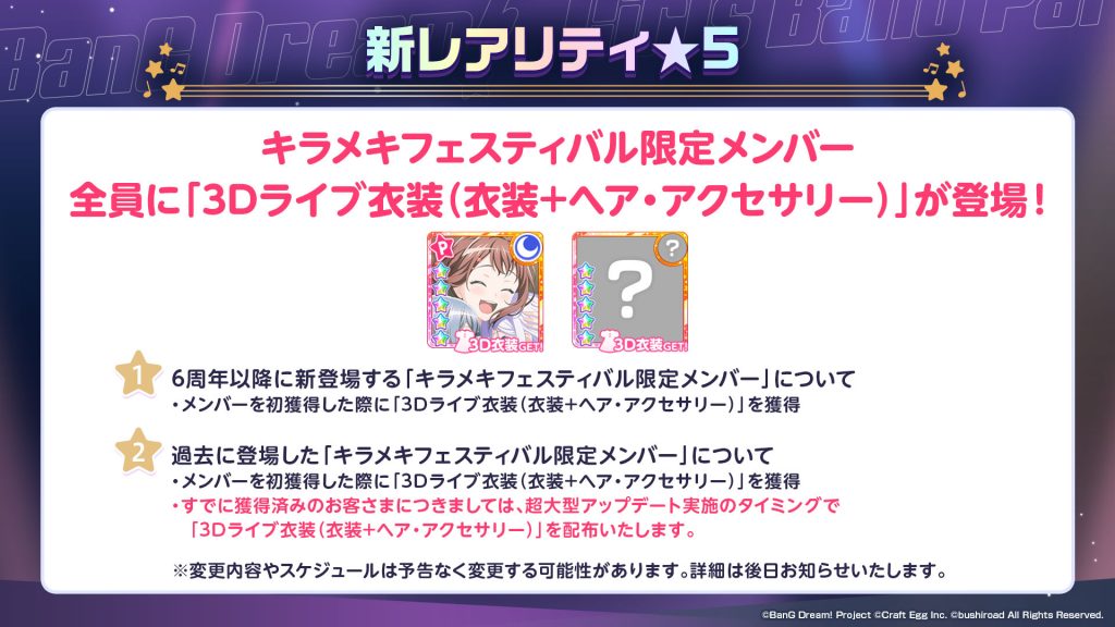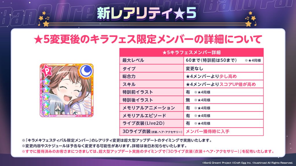 なので、6周年以降の「キラフェス限定メンバー」のみが★5メンバーとなると、6周年前と以降でキャラクター間での公平性が損なわれるため、過去に登場した「キラフェス限定メンバー」も★5にレアリティを変更する判断をしております。