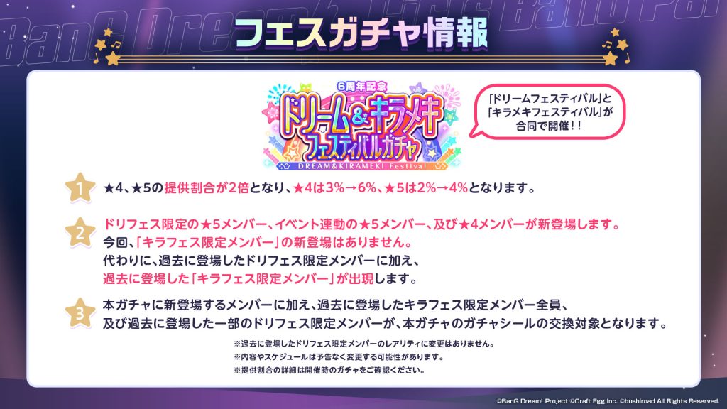 3月16日(木)の6周年を前に、過去に登場した「キラフェス限定メンバー」が再登場するガチャの開催なども考えましたが、提供割合の変化などを考慮すると公平性を保った提供が難しいため、3月16日の合同開催が一番みなさんにとって良い形であると判断しました。