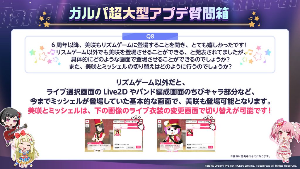 リズムゲーム以外だと、ライブ選択画面のLive2Dやバンド編成画面のちびキャラ部分など、今までミッシェルが登場していた基本的な画面で、美咲も登場可能となります。美咲とミッシェルはライブ衣装の変更画面で切り替えが可能です。
