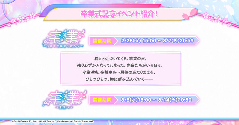 卒業は少し寂しいものもありますが、シーズン3に向けて彼女たちが踏み出す大きな一歩をぜひ感じていただければと思います。3月8日(水)からのイベントもかなりエモいものになっていますので、楽しみにお待ちください。