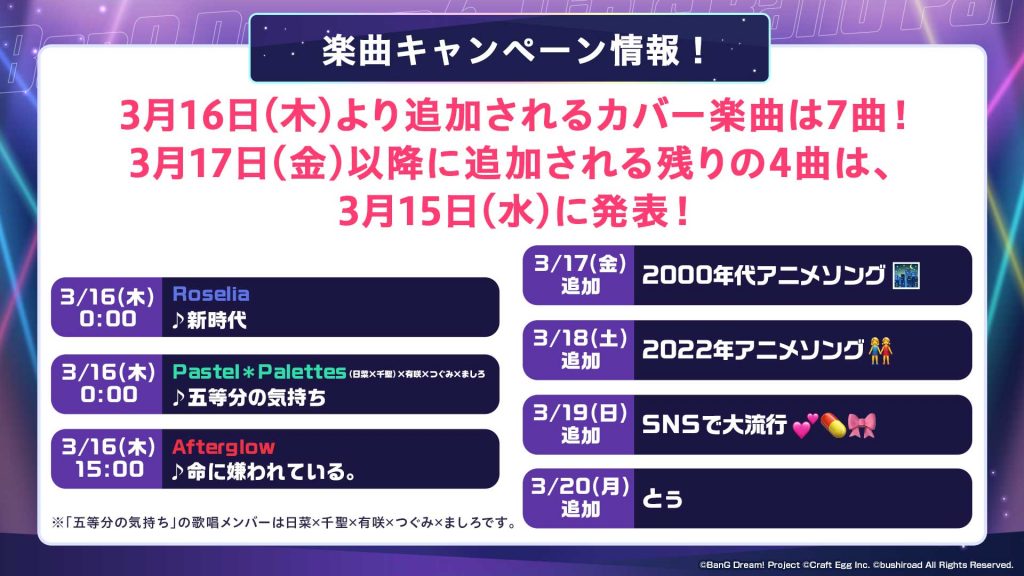 ありがとう6周年!カバー楽曲追加キャンペーン!では3月16日(木)0時から順次、カバー楽曲を7曲追加していきます。