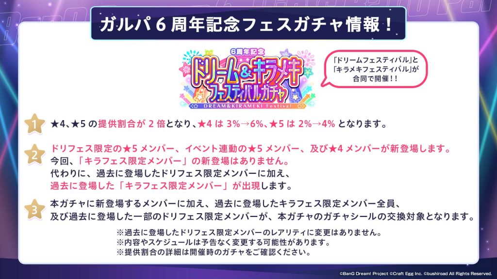 このほかにも『ガルパ6周年超大型アップデート直前特番』では、6周年記念キャンペーン情報や、6周年記念配信情報などたくさんの新情報を発表させていただきました。発表内容についてはゲーム内のお知らせでもまとめておりますので、そちらも合わせてご確認ください。