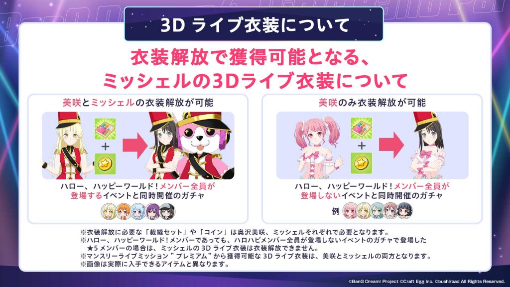 ※ハロー、ハッピーワールド!メンバーであっても、ハロハピメンバー全員が登場しないイベントのガチャで登場した★5メンバーの場合は、ミッシェルの3Dライブ衣装は衣装解放できません。