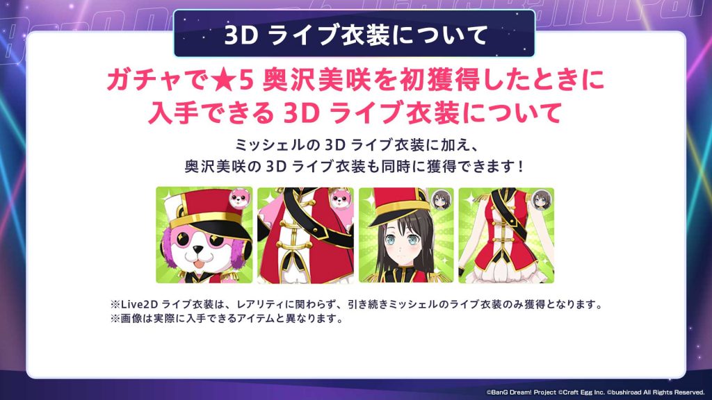 ※マンスリーライブミッション”プレミアム”から獲得可能な3Dライブ衣装は、美咲とミッシェルの両方となります。