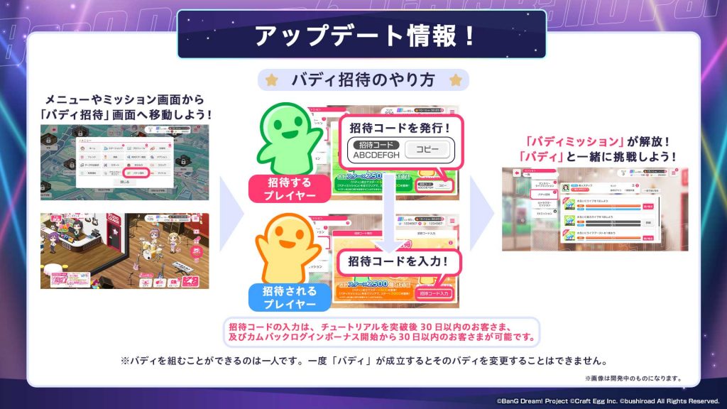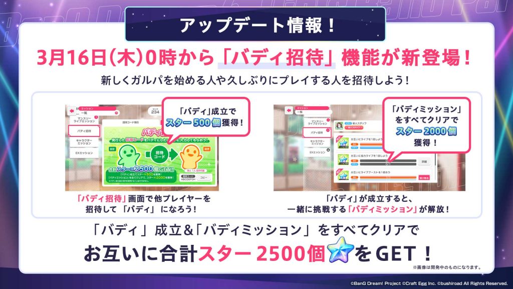 「バディ招待」機能が登場した際には、新しくガルパを始める人や久しぶりにガルパを遊ぶ人を招待してぜひ一緒に遊んでみてください。