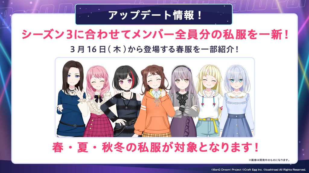 シーズン3に合わせて、メンバー全員分の私服を一新いたします。春・夏・秋冬の私服が対象です。また、RAISE A SUILENの私服にも春・夏・秋冬が登場します。