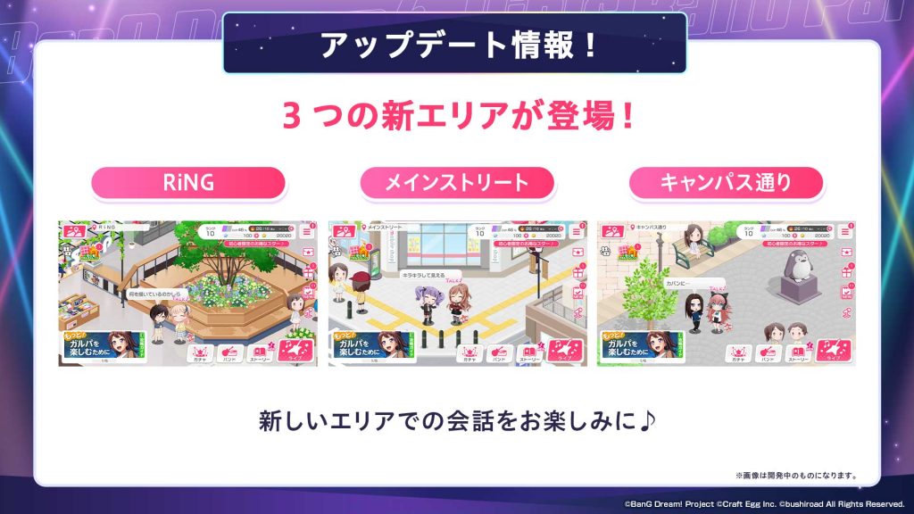 ガルパ内に3つの新エリアが登場します。新エリアの名称は「RiNG」「メインストリート」「キャンパス通り」です。この新エリアがシーズン3でどうストーリーに関わってくるのか、楽しみにしていただければと思います。