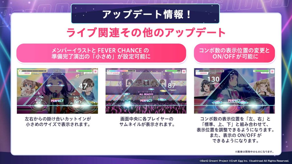 今回のアップデートでは、メンバーイラストとFEVER CHANCEの準備完了演出の「小さめ」が設定可能になります。さらにコンボ数の表示位置の変更とON/OFFが可能になります。