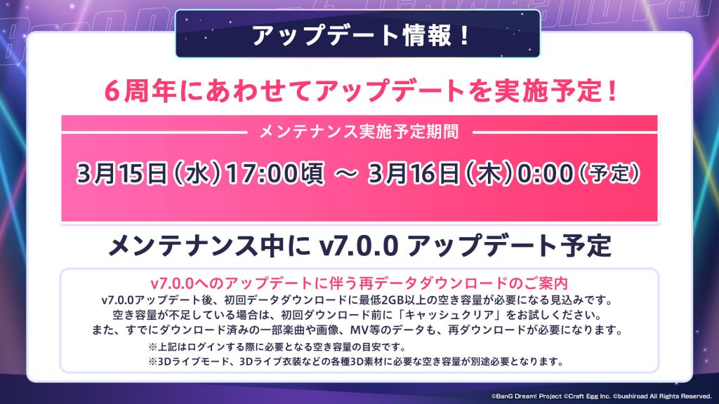 v7.0.0アップデート後、初回データダウンロードに最低2GB以上の空き容量が必要になる見込みです。空き容量が不足している場合は、初回ダウンロード前に「キャッシュクリア」をお試しください。また、すでにダウンロード済みの一部楽曲や画像、MV等のデータも、再ダウンロードが必要になります。