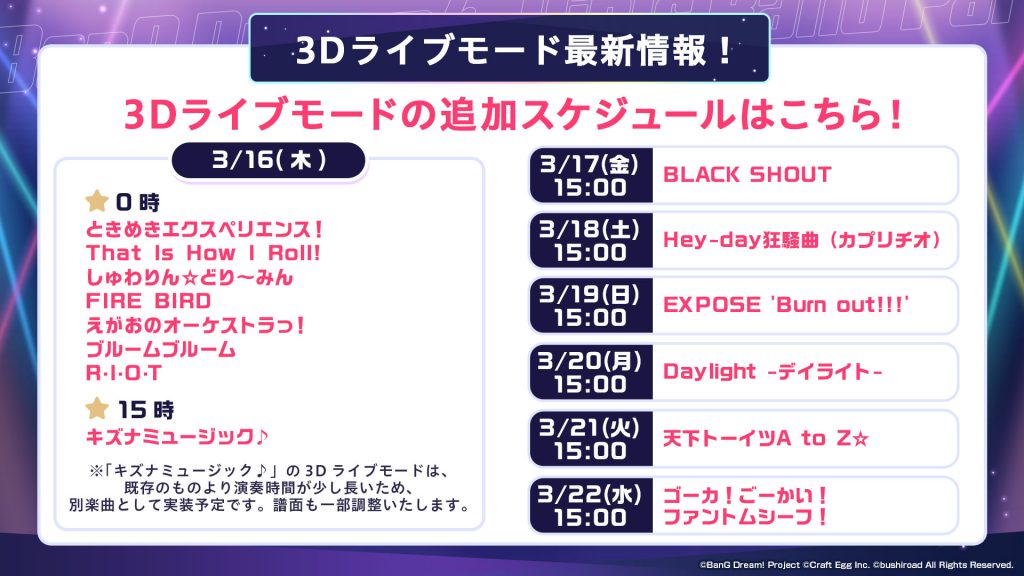 今回『ガルパ6周年超大型アップデート直前特番』では2曲目となる3Dライブモードの映像を一部だけお見せしました。2曲目の全編に関しては3月16日(木)以降、順次ゲーム内に追加されますので、楽しみにお待ちください。