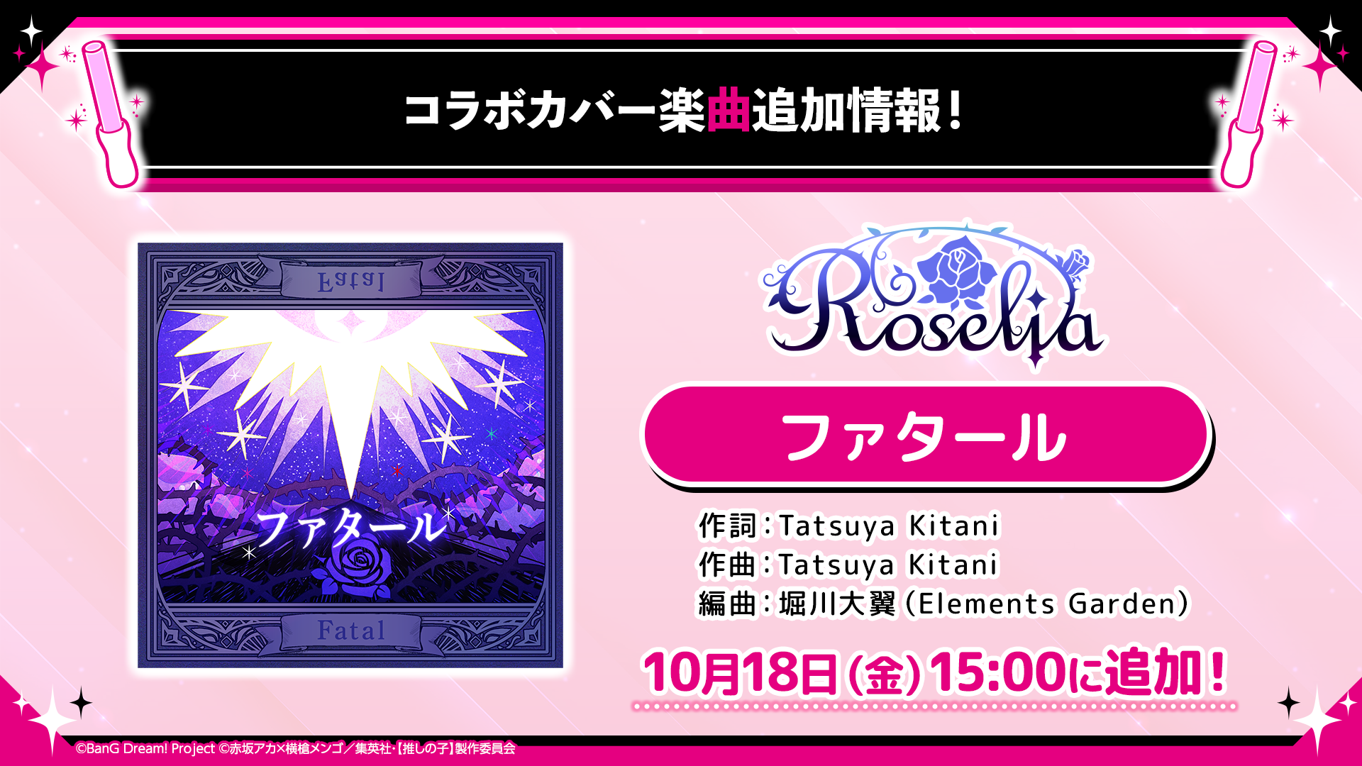 「ガルパ×【推しの子】コラボ Part2」の開催を記念して、2024年10月18日(金)15:00よりカバー楽曲を追加いたします。カバー楽曲は、Roseliaが歌う『ファタール』に決定いたしました。