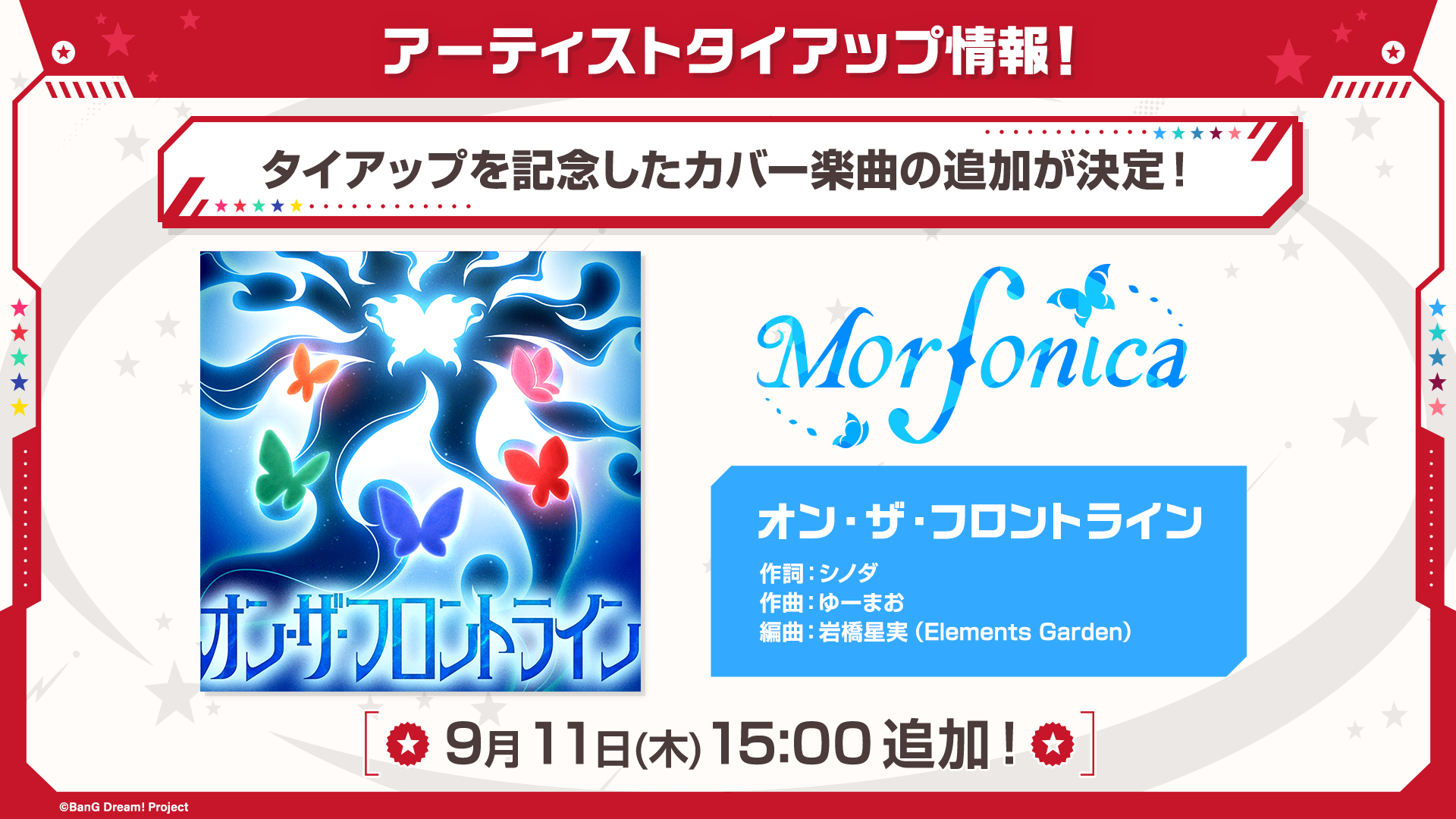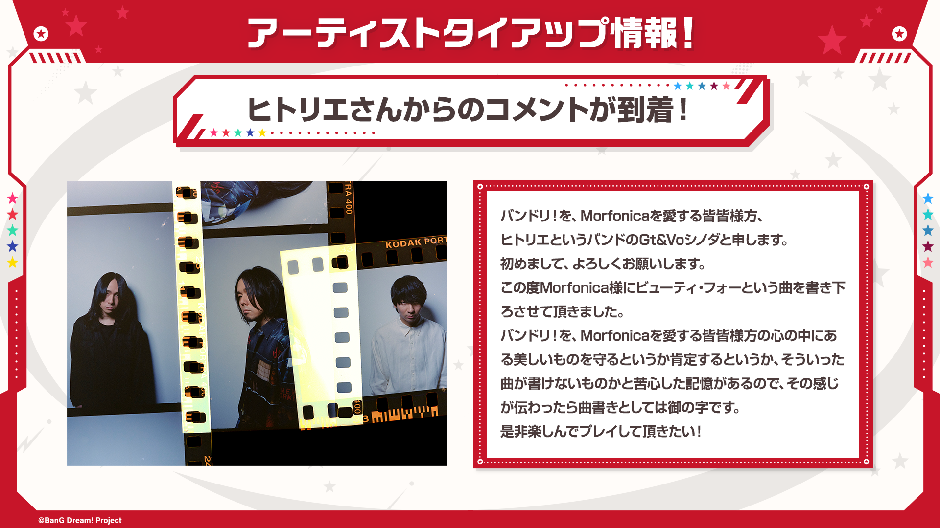アーティストタイアップ「Morfonica×ヒトリエ」を、9月11日(木)15時より実施することが決定いたしました。ヒトリエさんがMorfonicaのために書き下ろした楽曲『ビューティ・フォー』と、本楽曲のアニメーションMVをゲーム内に追加いたします。