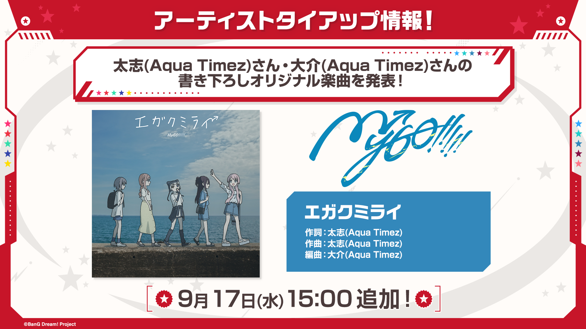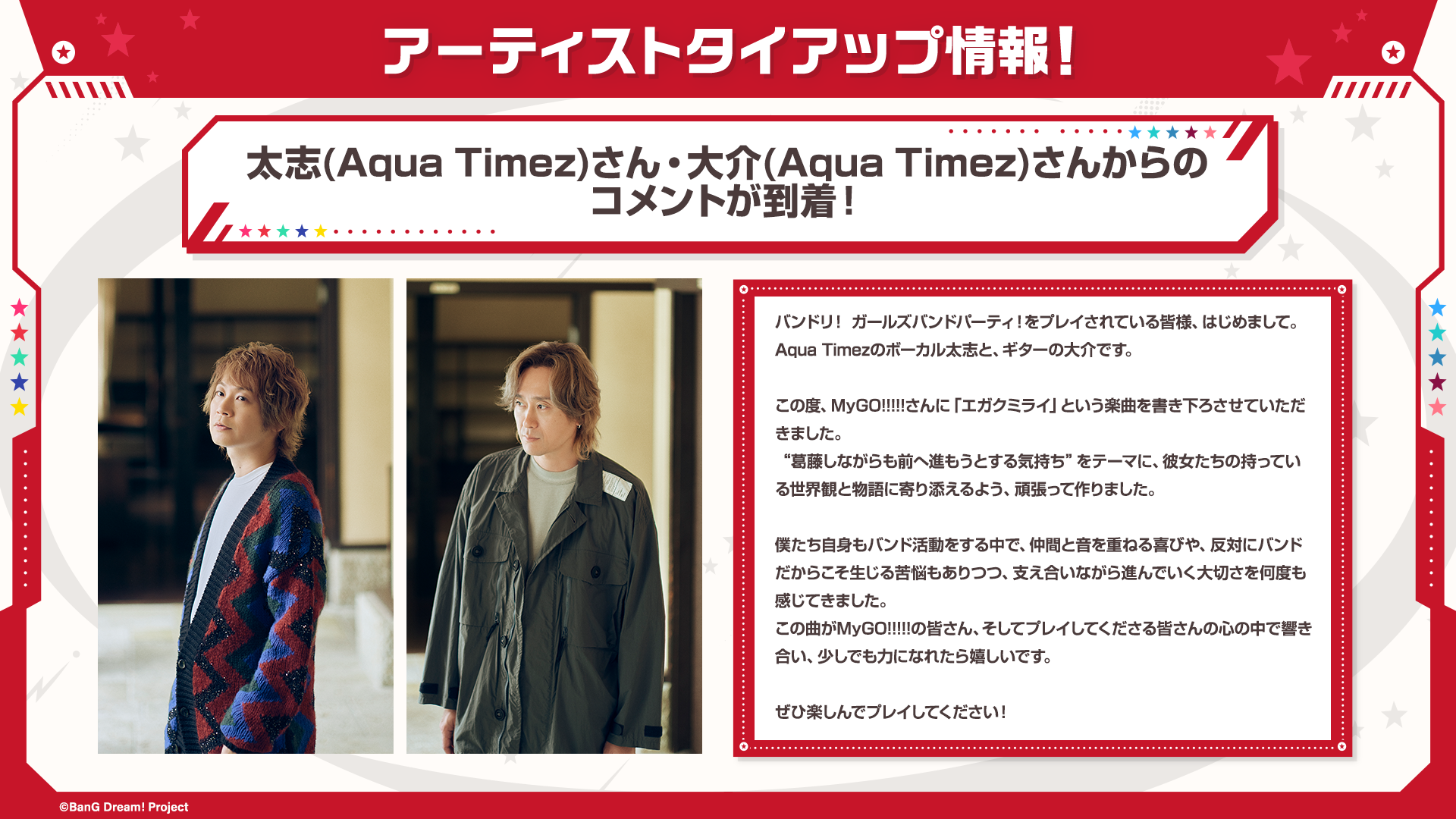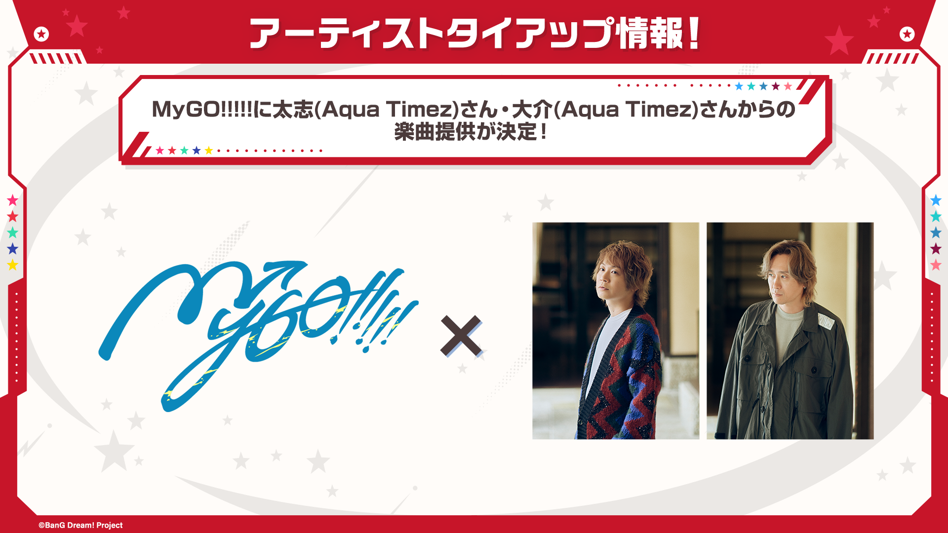 アーティストタイアップとして、MyGO!!!!!に太志(Aqua Timez)さん・大介(Aqua Timez)さんからの楽曲提供が決定いたしました。実施は9月17日(水)15時を予定しております。