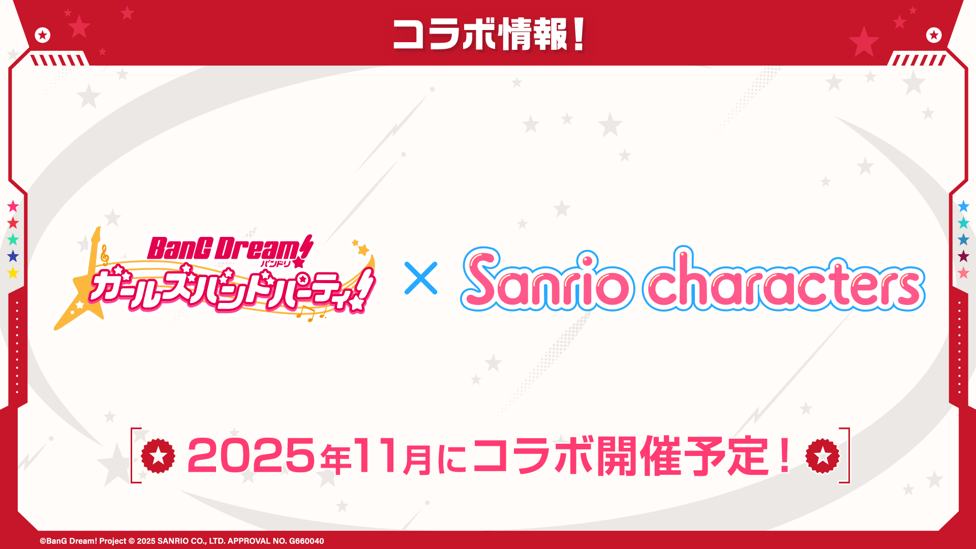 2025年11月より「バンドリ! ガールズバンドパーティ!×サンリオキャラクターズコラボ」の開催が決定いたしました。詳細は後日発表いたしますので、続報をお待ちください。