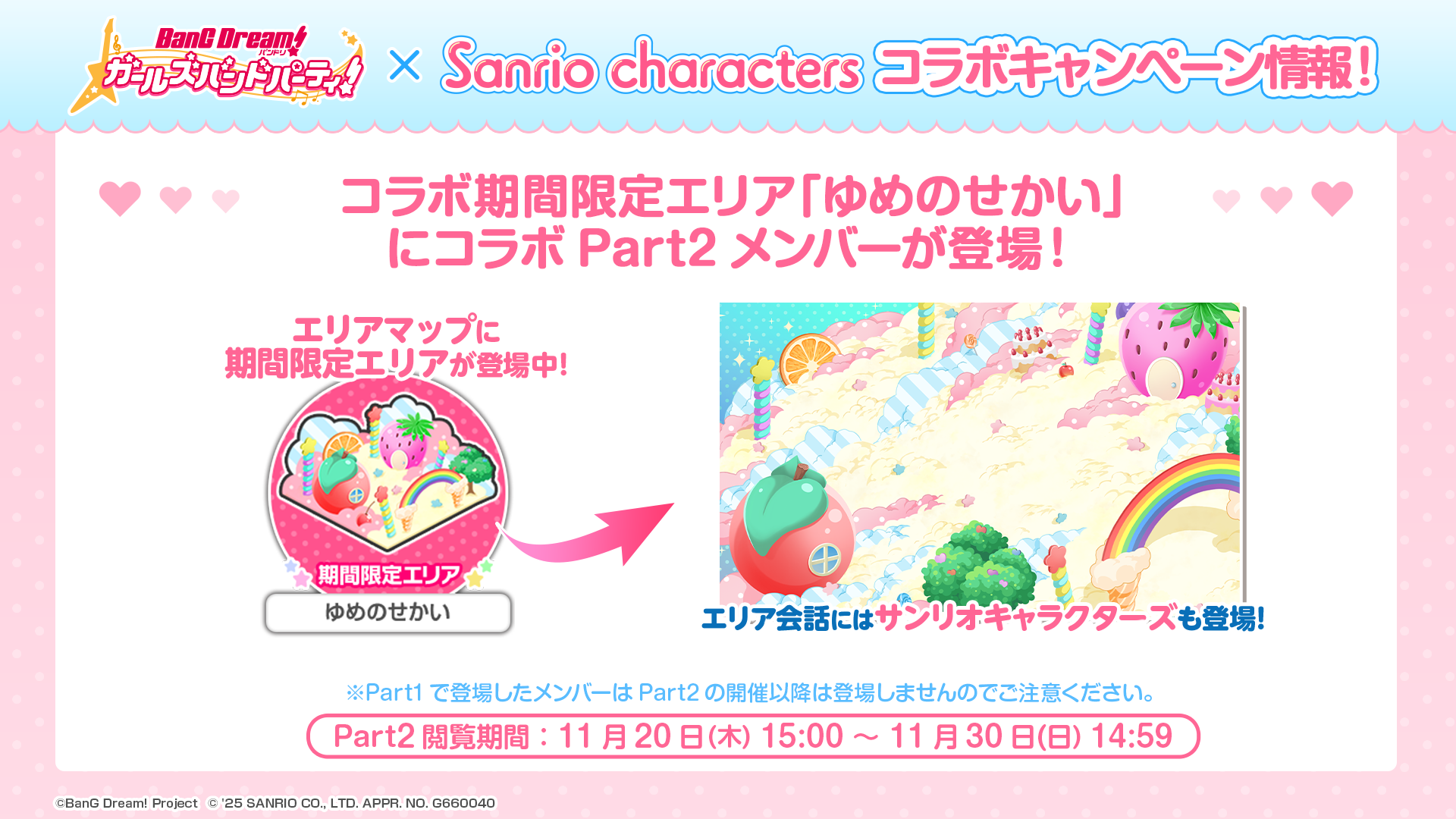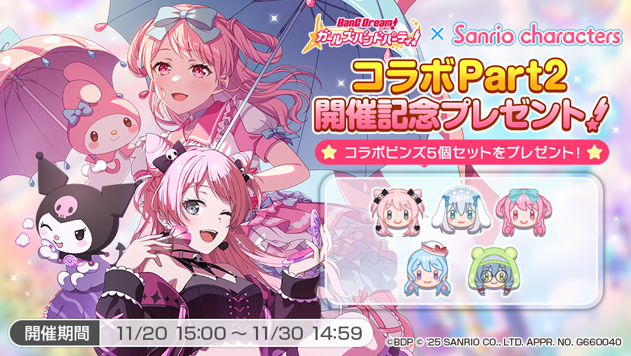 2025年11月20日(木)より、サンリオキャラクターズとのコラボPart2を開催いたします。本コラボレーション企画では、ガルパメンバーがゲーム内のイベントとガチャでサンリオキャラクターズとコラボするほか、エクストラ楽曲の追加など、様々な企画を実施いたします。