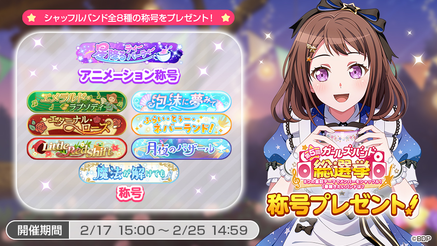 期間中にゲームにログインしてくれた方全員に、「シャッフルバンド全8種の称号」をプレゼントいたします。なお、1位となった「星降るティーパーティー」の称号はアニメーション称号となっております。