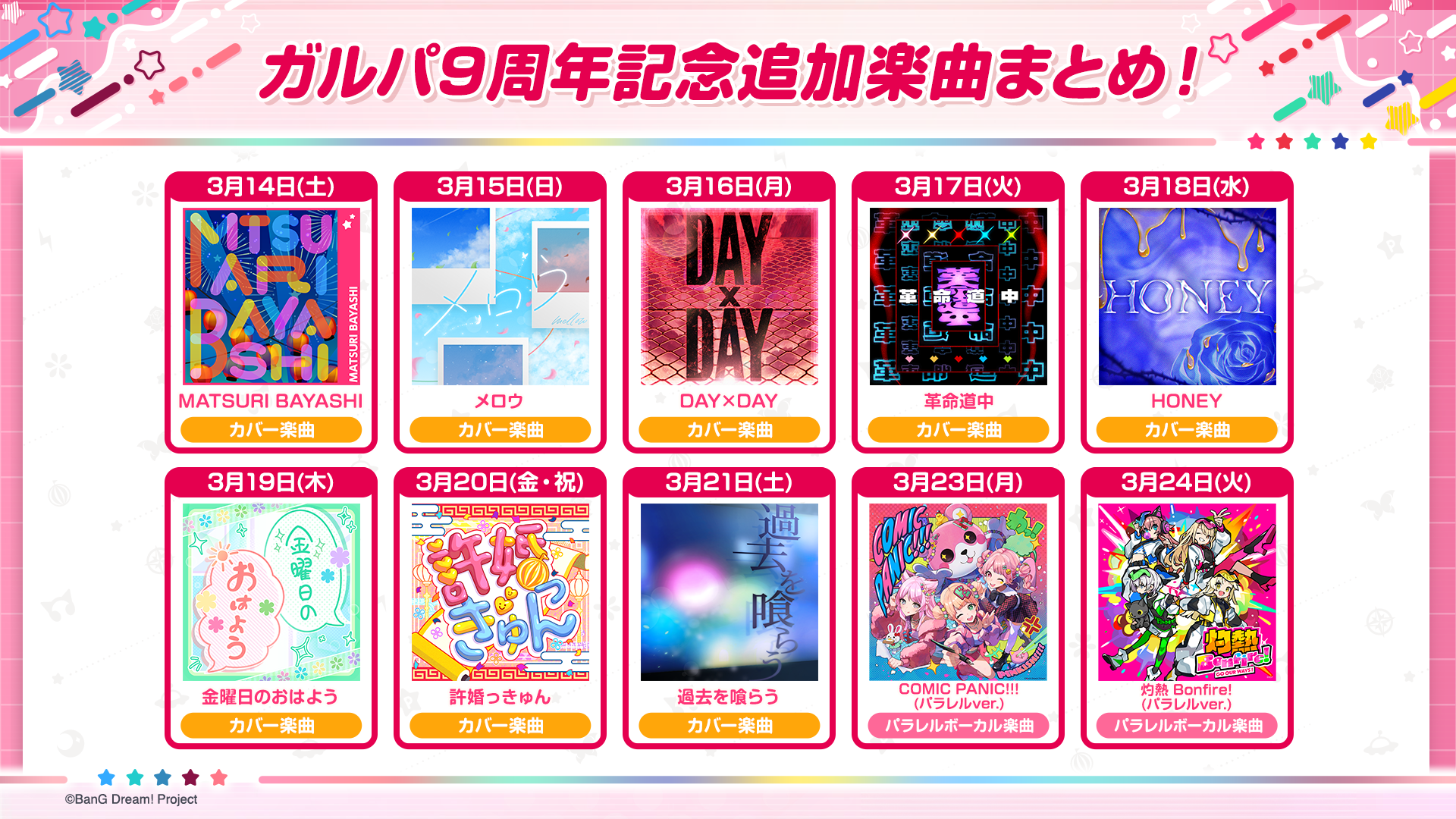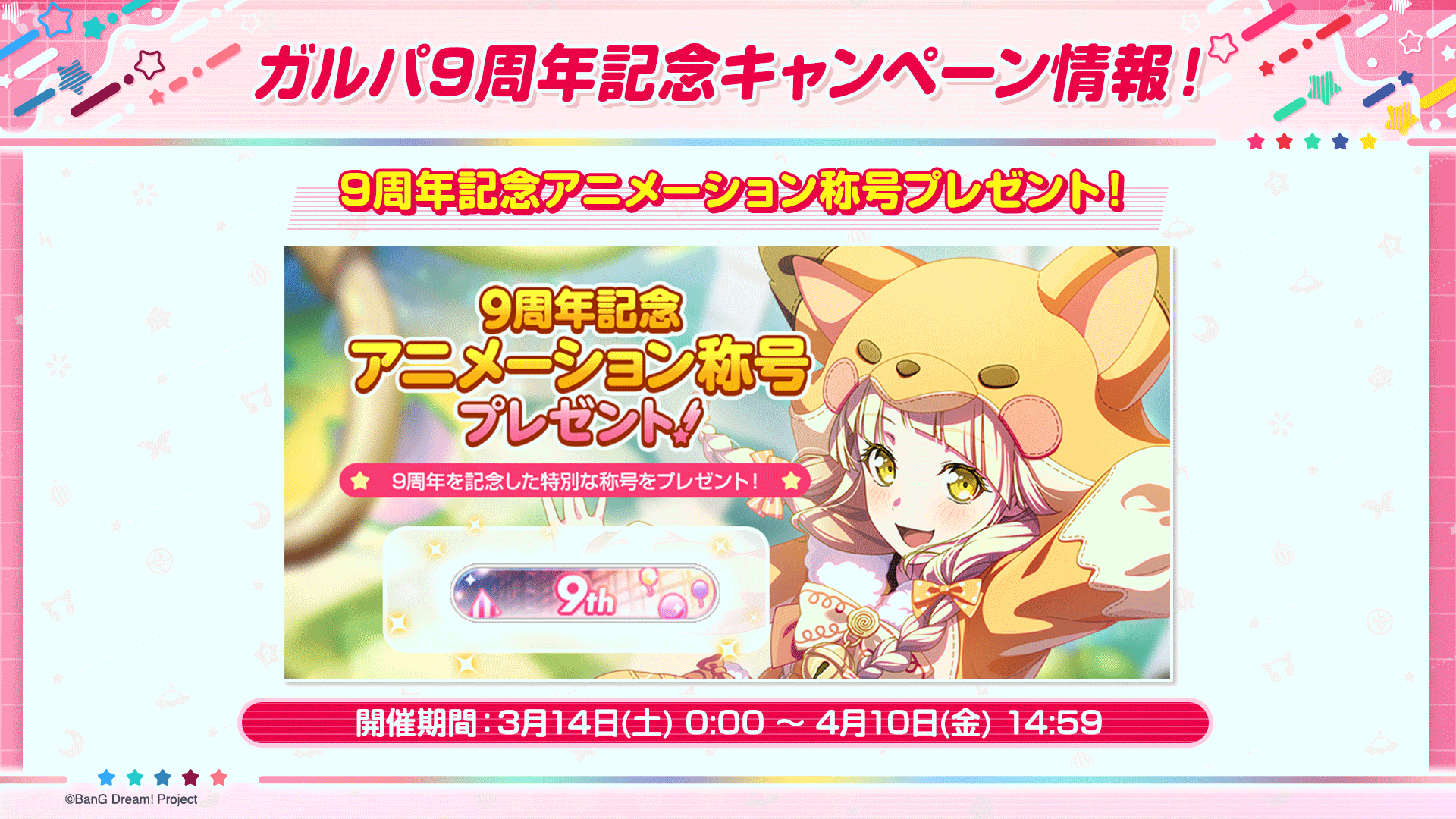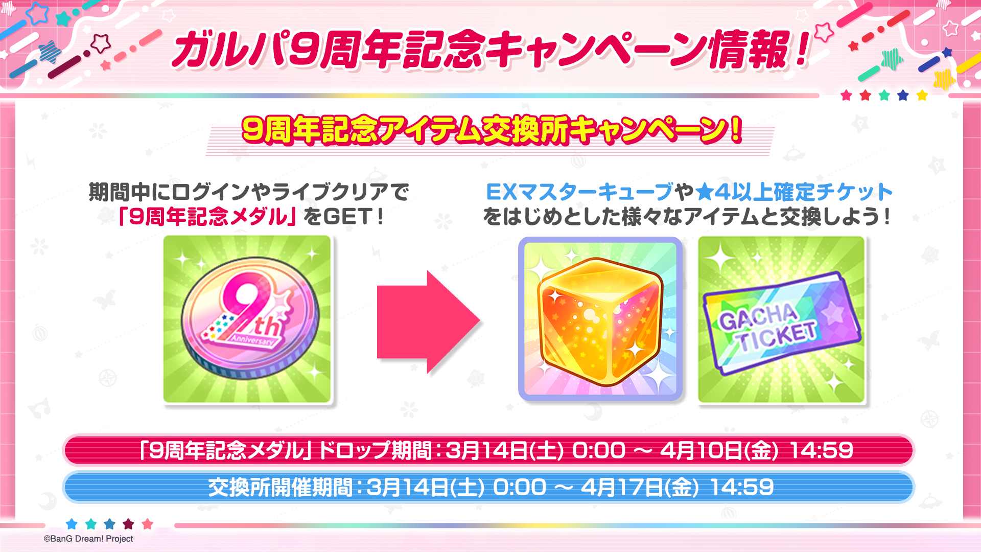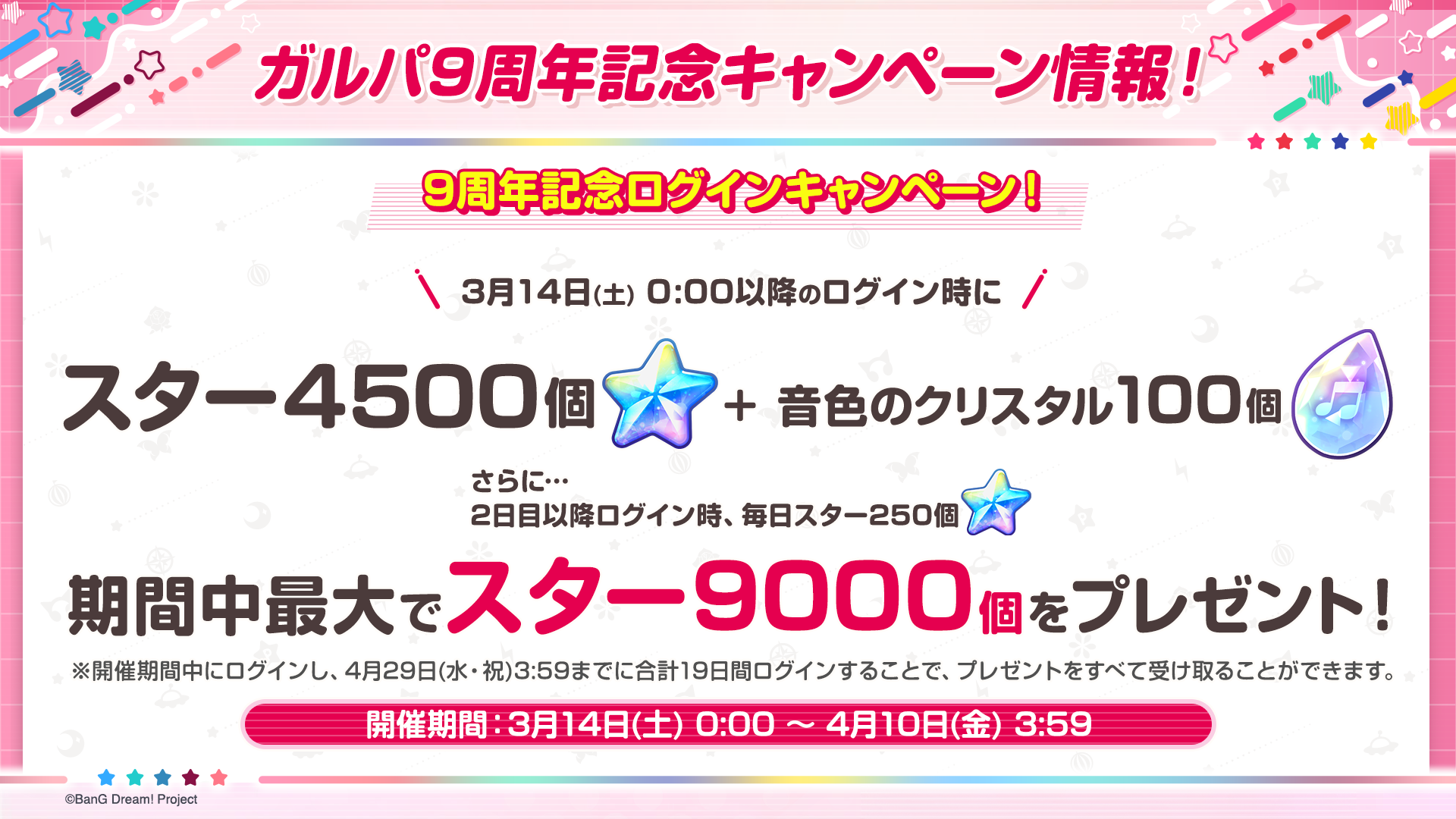 3月14日より、ガルパ9周年をより盛り上げるための各種キャンペーンを実施いたします。