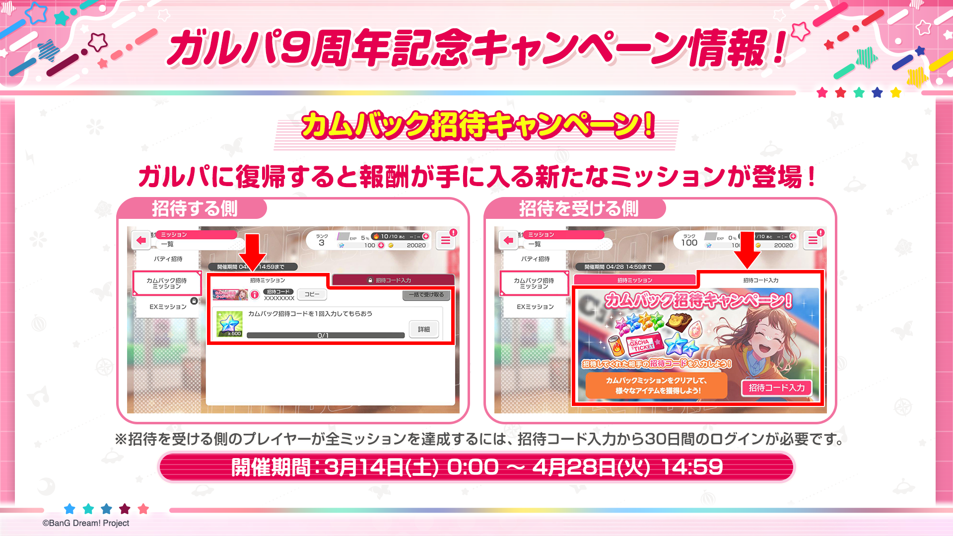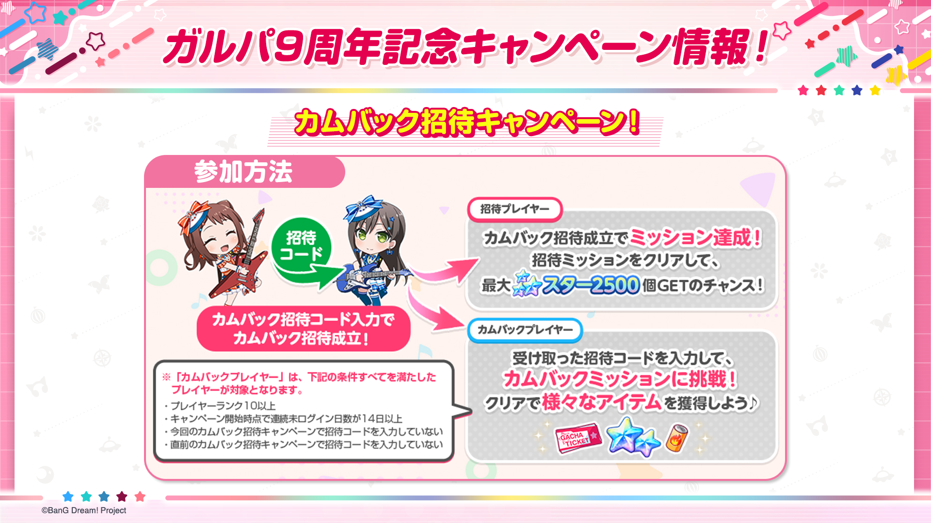 期間中、ガルパをプレイしている方が、ガルパを離れている方を招待することで、報酬が手に入るキャンペーンを開催いたします。