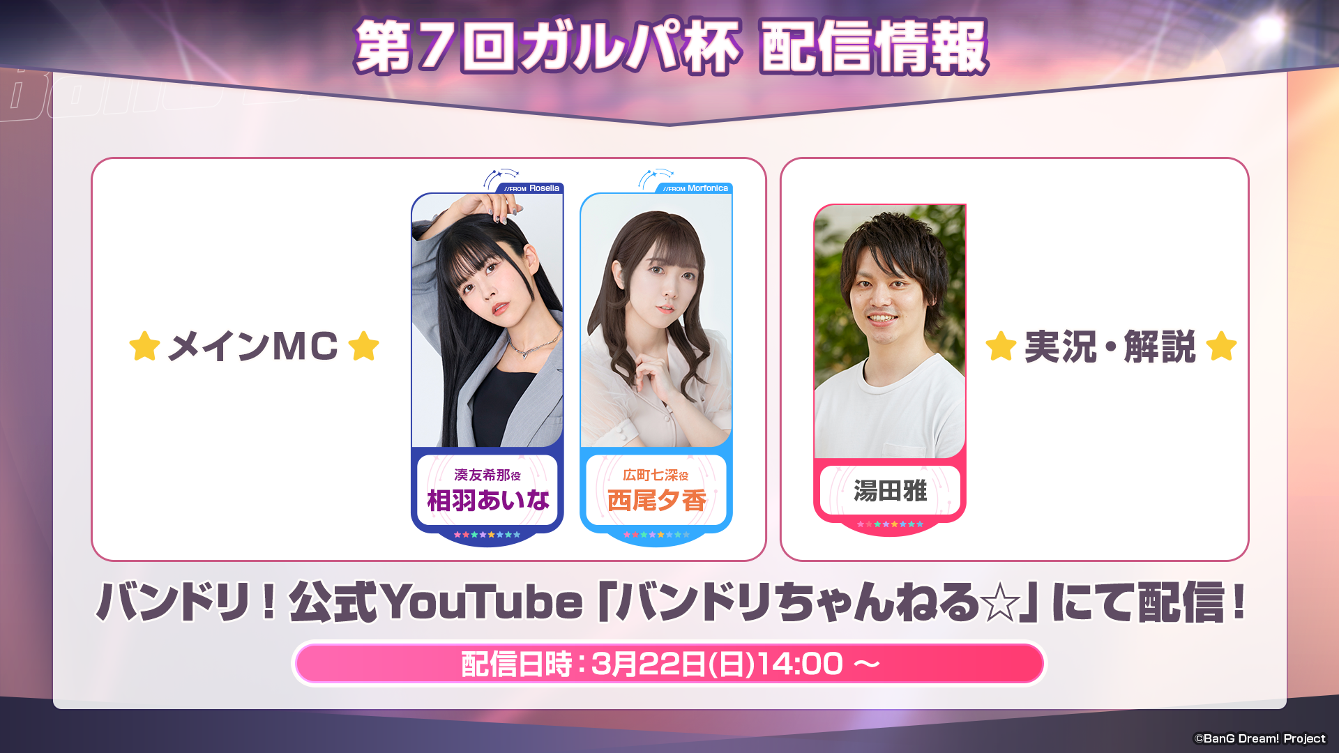 3月22日に第7回ガルパ杯の個人戦、チーム戦準決勝以降の模様を生配信でお届けいたします。熱い戦いをぜひお見逃しなく!